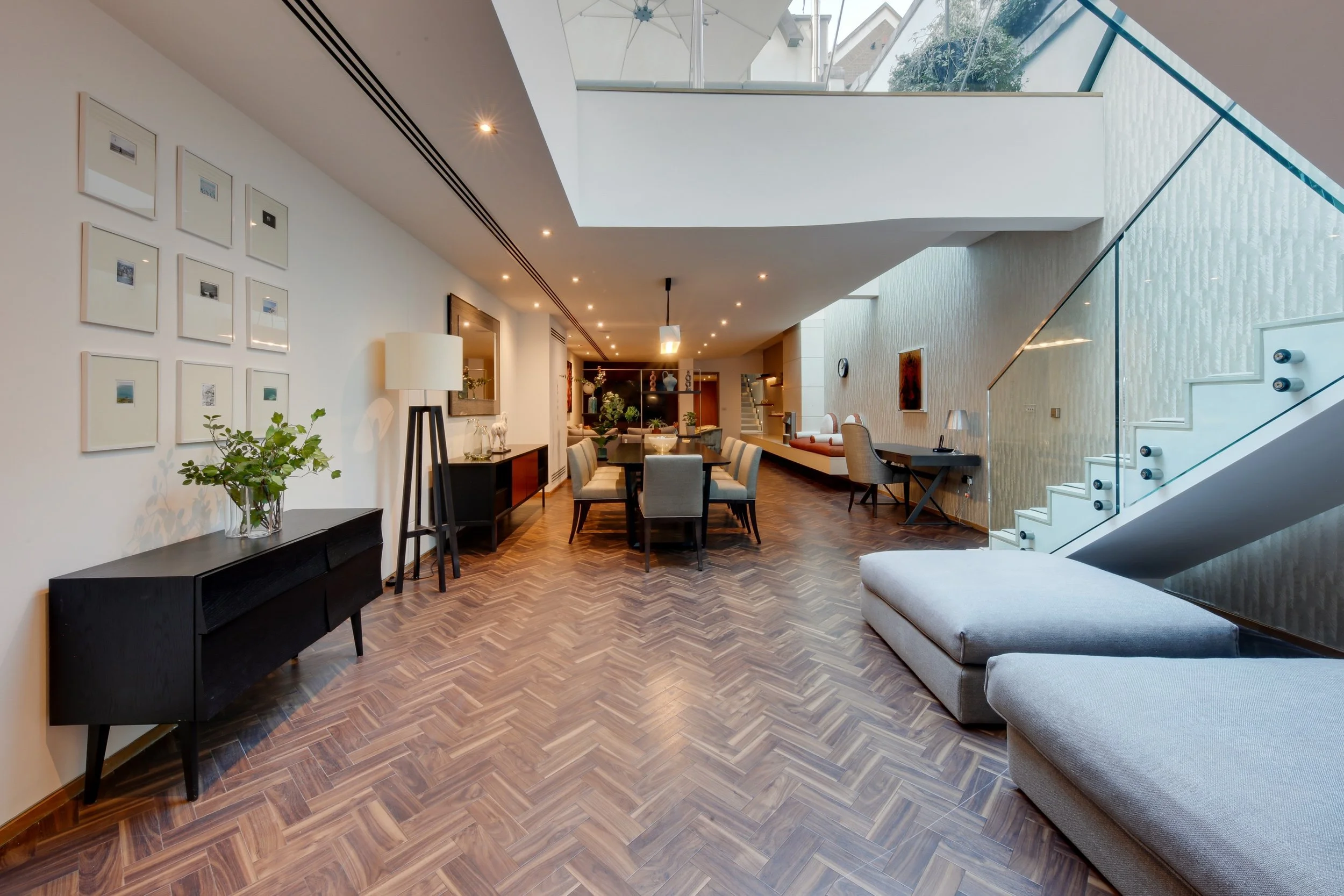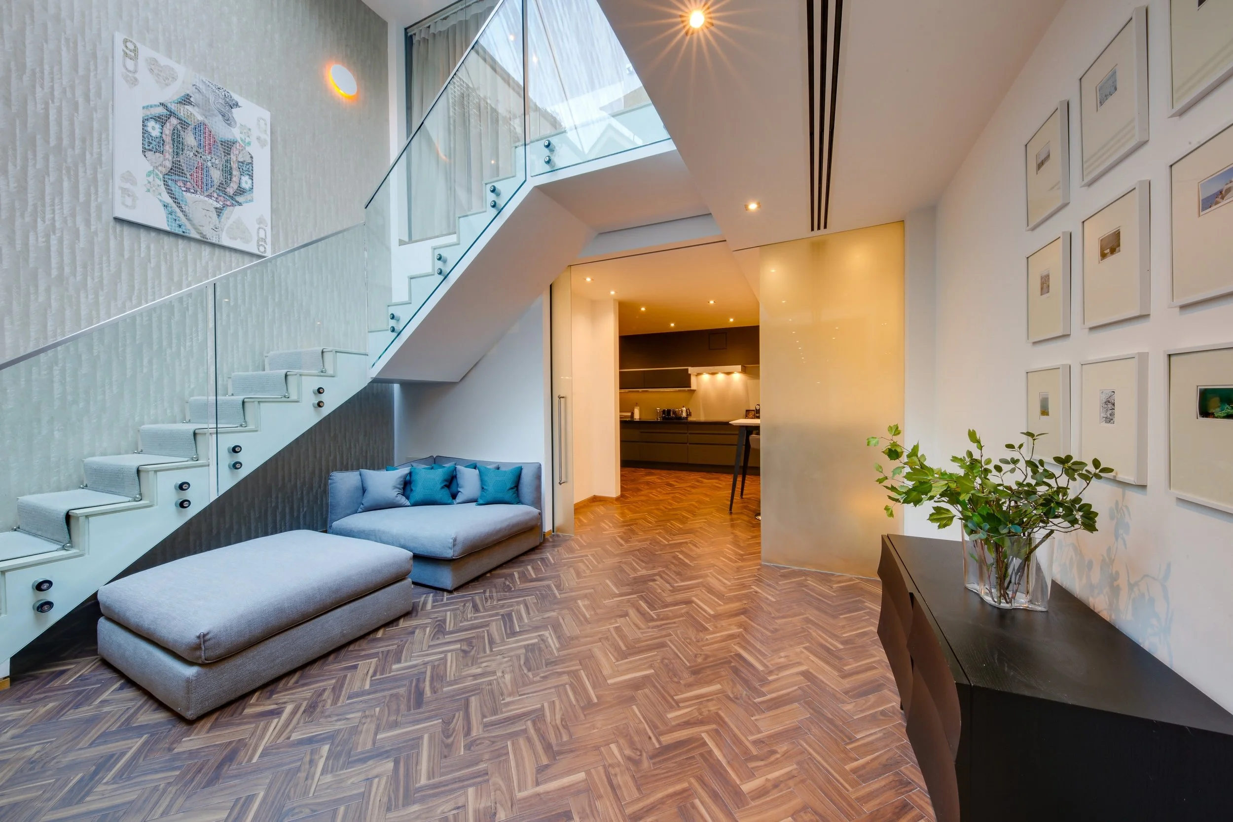 This remarkable 4-bedroom, 4-bathroom residence spans 261 sq/m across four floors, offering a truly elevated living experience in one of London’s most prestigious neighbourhoods. The grand open-plan reception room sets the tone for luxury, featuring elegant furnishings, plush seating, and a large flat-screen TV, the perfect space for relaxing or entertaining. The adjoining kitchen is fully equipped with high-end appliances, including a dishwasher, fridge-freezer, and Nespresso coffee machine, along with generous workspace and a welcoming dining area.